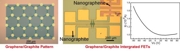 目前石墨烯的主要制备技术是利用化学气相沉积法在金属基底上制备,在进一步研究和应用中需要把石墨烯从金属基底上剥离下来,然后再转移到所需要的基底上,这个转移过程比较复杂繁琐,往往会造成样品的破坏(如褶皱,破裂)、成本提高和环境污染。近来,通过和中科院物理研究所葛炳辉研究员,湖南师范大学唐东升教授合作,该课题组发展了一种在不需要催化剂的情况下,利用光刻胶作为原料,在基底上直接制备出大面积的石墨烯。研究结果表明所制备石墨烯的厚度和光刻胶薄膜厚度紧密相关。利用这种方法,通过控制光刻胶薄膜的厚度和图案,可以方便的制备出所需的石墨烯/石墨图案,并进而发展了一种无金属的石墨烯/石墨场效应晶体管。相关结果发表在Chemical