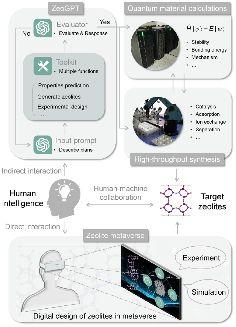 图2、复杂多孔结构数字化设计的未来平台蓝图,包括与人类智能的间接相互作用部分:ZeoGPT、量子材料计算和高通量合成,以及直接相互作用部分:沸石元宇宙