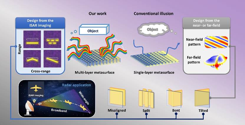 “幻像”是贯穿人类文明的一个引人入胜的话题。它指的是一种伪装技术,可以使人的眼睛或电磁波探测器将一个物体感知为另一个物体,完美地诠释了“所见并非所得”的概念。近年来,超表面的相关研究推动了幻像研究的进一步发展。通过设计超表面可以重建散射场,以实现幻像的效果。然而,大多数报道的单层幻像超表面设计为目标频率下的固定相位梯度分布,其通常只在狭窄的频带和特定的入射角下工作。此外,当前研究通常通过讨论近场或远场电磁场分布的方式来设计和评估幻像效果的优劣,这使得现有的幻像研究在设计过程和实际应用方面仍面临诸多困难。