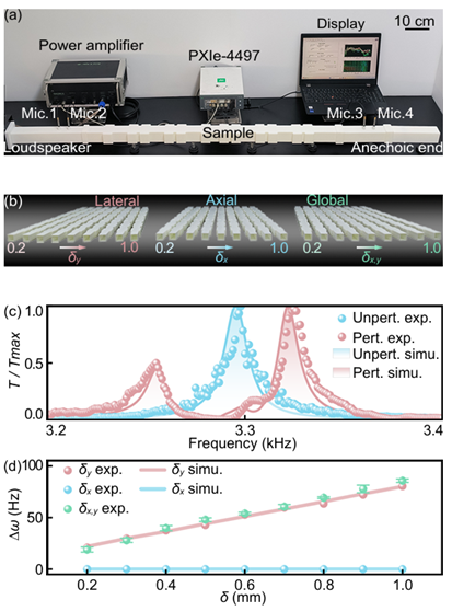 特别地,如图2所示,eTBIC是一种由Σ模式拓扑边界态嵌入Π模式体带而形成的特殊拓扑束缚态,其在透射谱中展现出极端各向异性的灵敏特性。这种行为源于系统内部不同模式之间的对称性差异:代表束缚态的Σ模式与波导传输模式在对称性上相匹配,而构成连续谱的Π模式则与之解耦。由于这一特殊的对称性关系,体系在平面波激励下无法激发Π体带,从而在透射谱中仅表现为eTBIC态对应的强透射峰。有趣的是,当施加横向结构扰动时,eTBIC态与Π体带发生杂化,导致透射峰劈裂,其劈裂宽度随扰动强度近似线性增长,体现出类BIC态的高灵敏度;而在轴向扰动下,透射峰保持不变,呈现出拓扑边界态的高鲁棒性[图3]。本发现拓展了拓扑物态与交叉领域的研究边界,并为新型高灵敏度传感器的设计提供了重要理论依据。