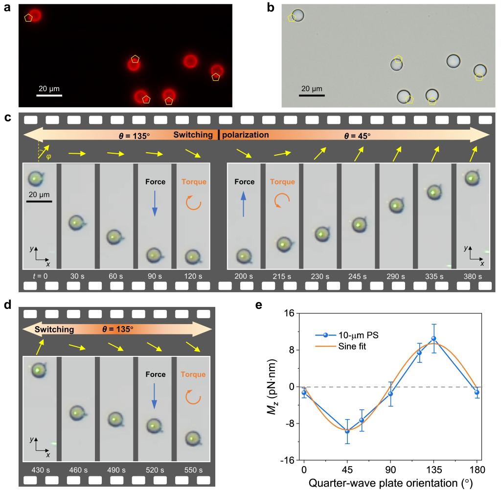 由于球形颗粒的高度对称性,很难观测到颗粒的旋转,因而实验中利用荧光染料染色的聚苯乙烯颗粒来观察并测量这种自旋梯度光力矩。荧光染料在高功率激光下会失活,但是会在颗粒上留下可忽略不计的残留物(图2a和b),足以观察到粒子的旋转,同时对光力和光力矩的影响可以忽略不计。实验中这种自旋力矩展示了与光偏振的强相关性,同时,还伴随着横向光力,当光偏振发生切换时,可以实现OT和OLF的大小与方向的变化(图2c,d和e)。