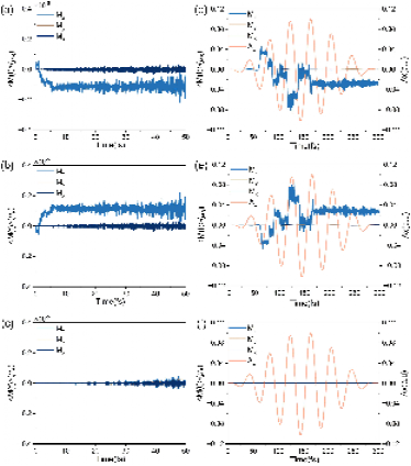 图 2 RT-TDDFT计算得到的Au纳米链的时间依赖磁响应。(a)-(c)在外偏压下,由于CISS效应所产生的磁响应。(a)、(b)、(c)分别对应左手性、右手性、无手性的Au纳米链。(d)-(f)在外加光作用下,由于PMChA所产生的磁响应。(d)、(e)、(f)分别对应左手性、右手性、无手性的Au纳米链。PMChA在手性Au纳米链中所诱导的磁性要远大于传统CISS。