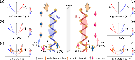 图 1 PMChA的微观过程可以分三步理解:首先,Au纳米链由于其结构手性产生轨道角动量(Lz)-动量(k)锁定的电子能带结构,且相反手性的Au纳米链其轨道角动量相反,如图(a)、(d)所示;其次,在Au纳米链的强自旋轨道耦合(spin-orbit coupling,SOC)HSOC=λL⋅S,Au纳米链的能带发生自旋劈裂,形成自旋-动量锁定的能带;最后,在外加光(hν)作用下,电子发生带间跃迁,动量接近入射光子动量处的吸收起主导作用,从而产生净磁性。