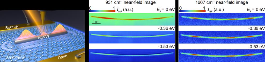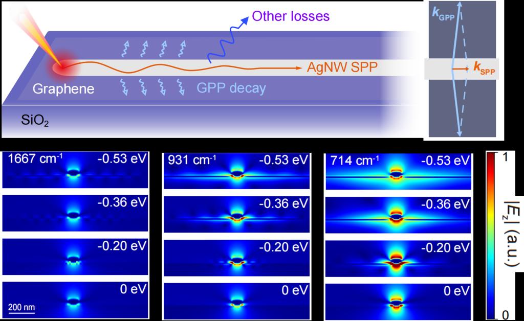 该论文构建了一种银纳米线-石墨烯异质结构电学器件,探索银纳米线上SPPs的电学调控特性。器件通过调节栅极电压动态改变石墨烯费米能量,以影响银纳米线SPPs的传播性质。利用散射式扫描近场光学显微技术,实验同步实现了SPPs的激发与观测,清晰展示了其电学调控效果(见图1)。结合实验观测与理论仿真,研究进一步揭示了银纳米线SPPs动态调控的波长选择性,并表明其调控机制并不是之前广泛报道的极化激元杂化,而是基于SPPs与石墨烯极化激元之间的能量转换(见图2)。该成果不仅为中红外波段银纳米线SPPs的有效调制提供了可行方案,也为更广泛的极化激元调控研究提供了基础,为实现动态可调的纳米光子器件开辟了新方向。