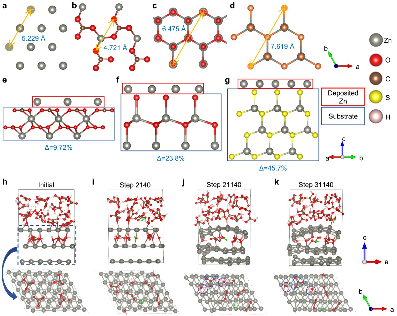 理论计算和数值模拟表明,具有与Zn(0002)面较低晶格失配度的ZnCO3(111)面存在较好的适配度,不仅利于后续电化学沉积过程中Zn的外延生长,同时利于实现Zn向ZnCO3转化的自生矿化过程。