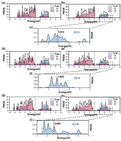 针对上述问题,本论文通过第一性原理计算,系统揭示了层间水在WO₃催化HER反应中的关键作用与微观机制。研究构建了系列水合度可控的WO₃模型,发现水分子插层能显著优化氢吸附能,使其从-2.513 eV(WO₃)减弱至-0.609 eV(WO₃·H₂O),并同步将氢脱附能垒从2.181 eV大幅降低至0.308 eV(见图1)。电子结构分析(见图2)表明,该调控源于层间水引起的费米能级附近态密度降低及氢原子s轨道中心上移,从而削弱了表面与氢的耦合强度。本研究的关键突破在于揭示了层间水对HER反应步骤的“双重调控”机制:它在促进氢脱附的同时,也提高了水裂解步骤的能垒。这一发现明确了在设计WO₃基协同催化体系时,应规避依赖其进行水裂解的反向氢溢流路径,转而利用其优化的正向氢溢流能力。该成果为通过“水合工程”精准设计高效HER催化剂提供了坚实的理论依据与全新的设计思路。