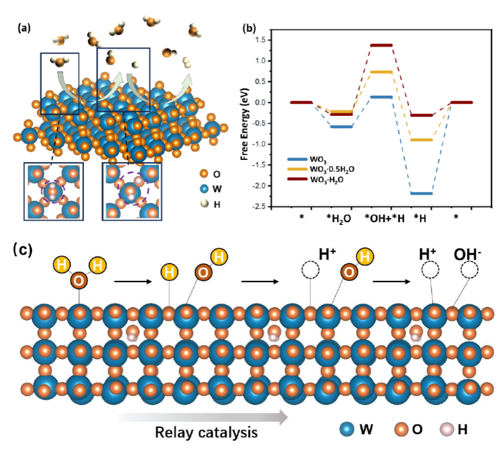 氢能因清洁高效而备受关注,而碱性析氢反应(HER)因需先裂解水分子而动力学受限。氢溢流效应通过多活性位点协同催化,可有效解耦水裂解与氢复合,是提升HER性能的重要策略。三氧化钨(WO₃)具有易还原与高效氢迁移特性,是理想的氢溢流载体,但其本征过强的氢吸附反而抑制氢气生成,因此需通过结构调控改善其性能。虽然层间水被发现能促进WO₃的质子传输,但其在原子尺度上影响HER的具体机制仍不清晰,限制了高效水合WO₃催化剂的优化设计。