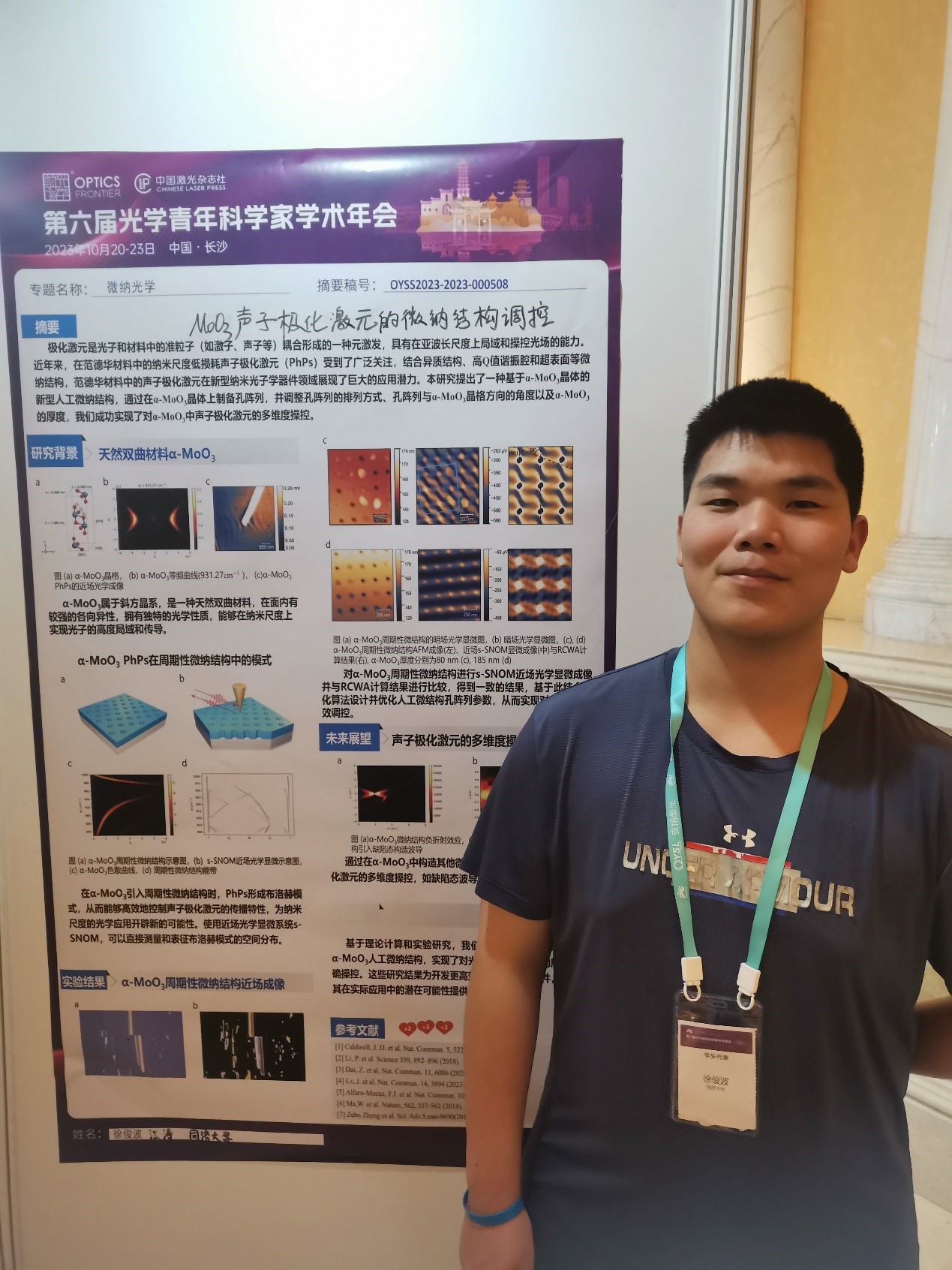 徐俊波同学分享了关于 "MoO3声子极化激元的微纳结构调控"的成果,该研究提出了一种基α-MoO3晶体的新型人工微纳结构,通过在α-MoO3晶体上制备孔阵列,并调整孔阵列的排列方式、孔阵列与α-MoO3晶格方向的角度以及α-MoO3的厚度,成功实现了对α-MoO3中声子极化激元的多维度操控。