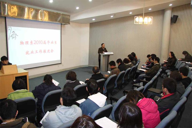 12月15日下午1:30瑞安楼报告厅,物理系召开了2010届毕业生就业工作推进会,物理系系主任王占山教授、系党总支书记周斌教授、副系主任羊亚平教授、波耳所副所长沈军教授和鲍鸿吉副教授以及相关人员和毕业班学生均参加了会议。系主任王占山教授、系党总支副书记考书健老师等均在会上发言。会议还特别邀请了买球官方网站大学生就业指导中心副主任陈红老师介绍在校学生在求职和职业规划方面的一些工作和(未来的一些)计划。