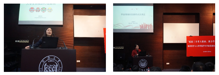 姚玉红副教授与张南华老师分别做“大学生自我的心理建构”和“学业情绪的发展特点及调试”报告