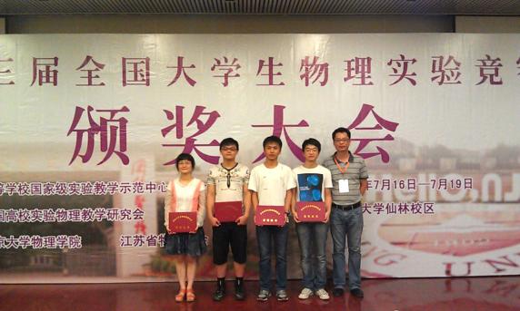 第三届全国大学生物理实验竞赛与2015年7月16日至18日在南京大学仙林校区举行,来自各国家级物理实验教学示范中心、国家物理拔尖计划高校、国家理科基础科学研究和教学人材培养基地物理学专业点、国家工科基础课程物理教学基地等五十所高校共169名选手参加了本次大赛。买球官方网站物理学院2012级徐俊文、丁姗姗、刘林、刘加贝四位同学组队参赛,领队由倪晨老师担任。经过紧张激烈的角逐,买球官方网站队凭借着扎实的理论功底和娴熟的实验技巧,最终分获一、二、三等奖的好成绩。其中刘林获得基础性实验项目一等奖,徐俊文与丁姗姗同学获得综合性实验项目二等奖,刘加贝同学获得基础性实验项目三等奖。