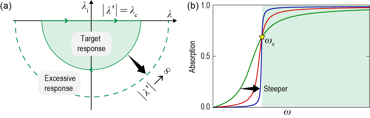 图1 (a) 声学材料频率响应的复波长平面分析。(b) 不同响应函数的吸收谱。