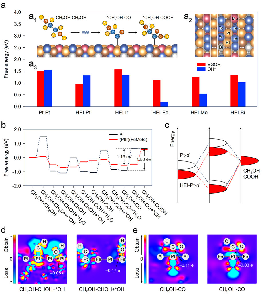 图3.DFT计算。(a1)(PtIr)(FeMoBi)表面的EGOR反应结构示意图。(a2)(PtIr)(FeMoBi)表面的元素分布。(a3)铂和(PtIr)(FeMoBi)不同金属位点上RDS步骤的自由能垒。(b)铂和(PtIr)(FeMoBi)表面上OH辅助EGOR反应的自由能曲线。(c)铂和(PtIr)(FeMoBi)中铂位点的D波段中心。(d)CH2OH-CHOH与Pt之间以及CH2OH-CHOH与(PtIr)(FeMoBi)之间的电荷差。(e)CH2OH-CO与Pt之间以及CH2OH-CO与(PtIr)(FeMoBi)之间的电荷差。