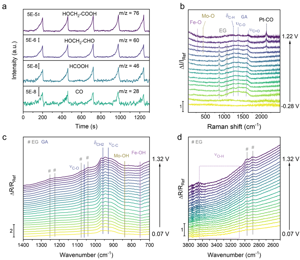 图2.原位表征。(a)(PtIr)(FeMoBi)在1 M KOH和1 M EG中的在线差分电化学质谱(DEMS)。(b)(PtIr)(FeMoBi)在-0.28~1.22 V电位范围内相对于RHE的原位电化学拉曼光谱。(c,d)(PtIr)(FeMoBi)在0.07~1.32 V电位范围内相对于RHE的原位ATR-SEIRAS光谱。