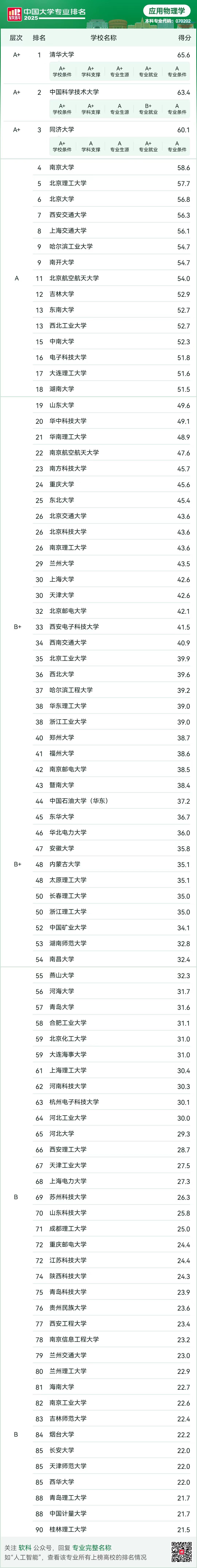 在应用物理学专业排名中,共有90所高校上榜,买球官网“应用物理学”专业位列A+层次,高校全国排名第三位。