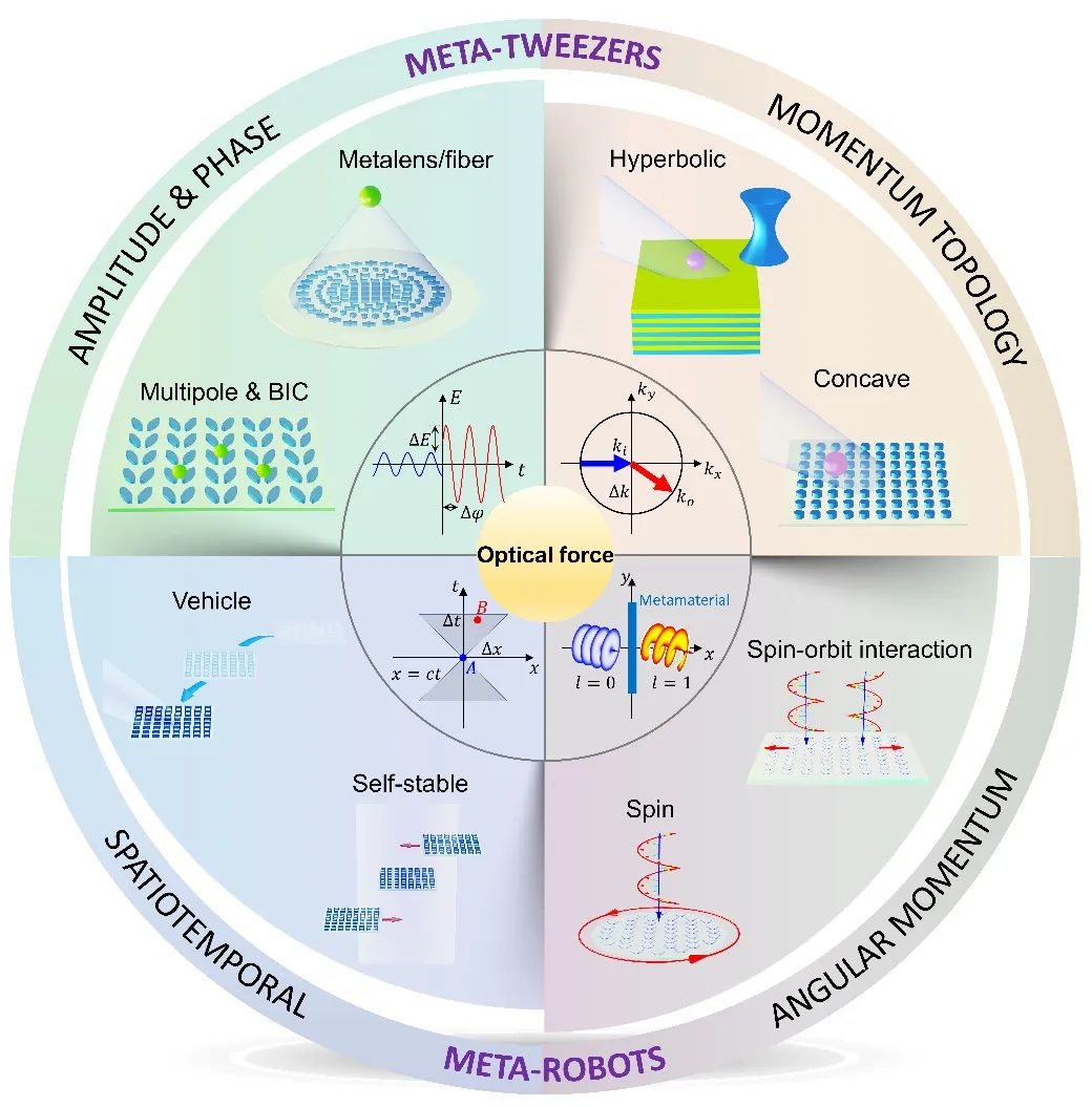图1:超构材料光镊的典型构型分为两大类:“超构光镊”(Meta-tweezers)和“超构机器人”(Meta-robots)。本文从振幅和相位、动量空间、时空以及角动量四个角度总结了超构材料光镊的典型原理和应用。