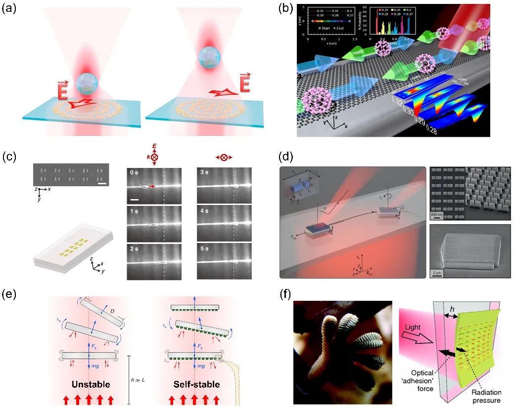 图2:超构材料光镊中光力的动态调控:a,光的不同偏振方向控制颗粒的捕获位置;b,光学势阱的动态调控用于颗粒分离;c,等离子体“超构机器人”的直线运动;d,“超构机器人”在线偏振光和圆偏振光作用下分别以直线运动和转动,实现二维运动;e,“超构机器人”在高斯光束中的自稳定现象;f,“超构机器人”可与衬底产生吸引或排斥力。