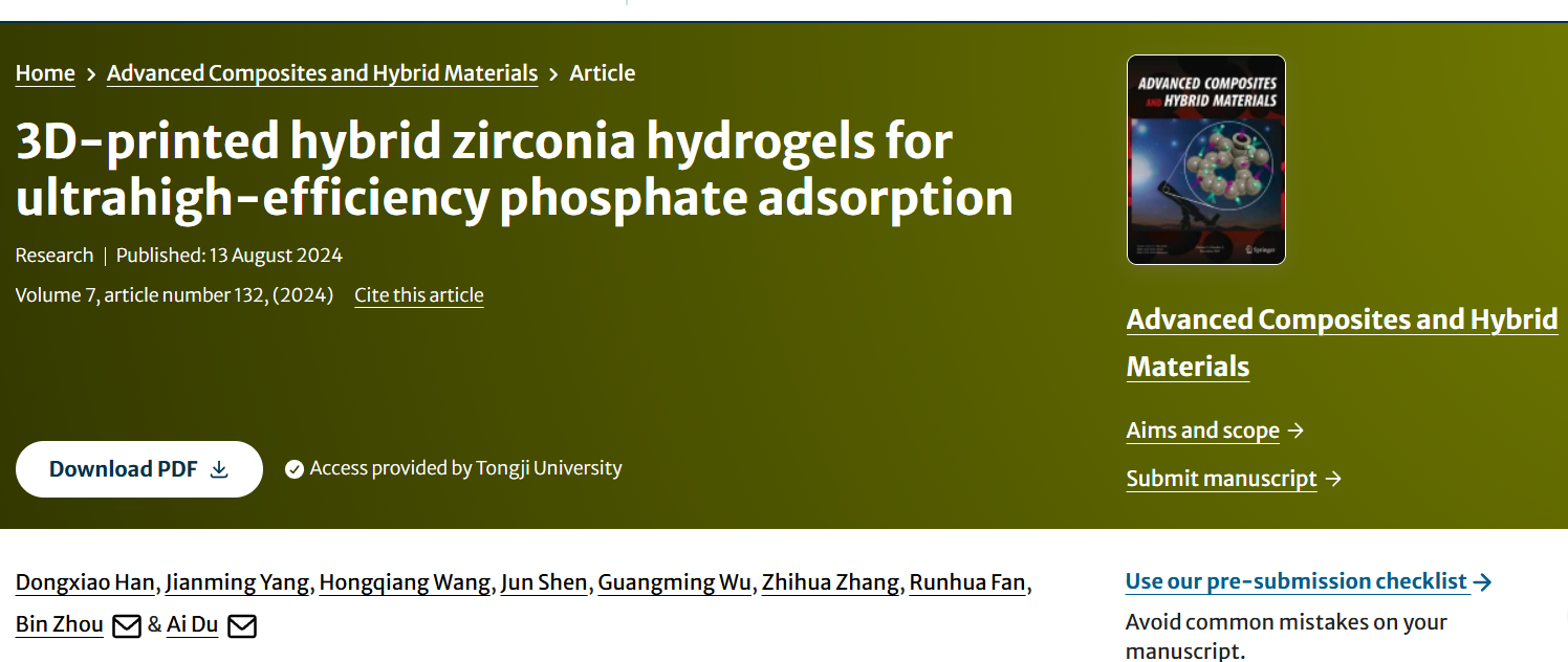 近日,买球官方网站杜艾教授和周斌教授团队联合上海海事大学海洋科学与工程学院材料系的范润华教授在国际知名期刊《先进复合物和杂化材料》(Advanced Composites and Hybrid Materials)在线发表了题为“3D-printed hybrid zirconia hydrogels for ultrahigh-efficiency phosphate adsorption”的研究论文。论文第一作者为买球官方网站博士生韩东晓。