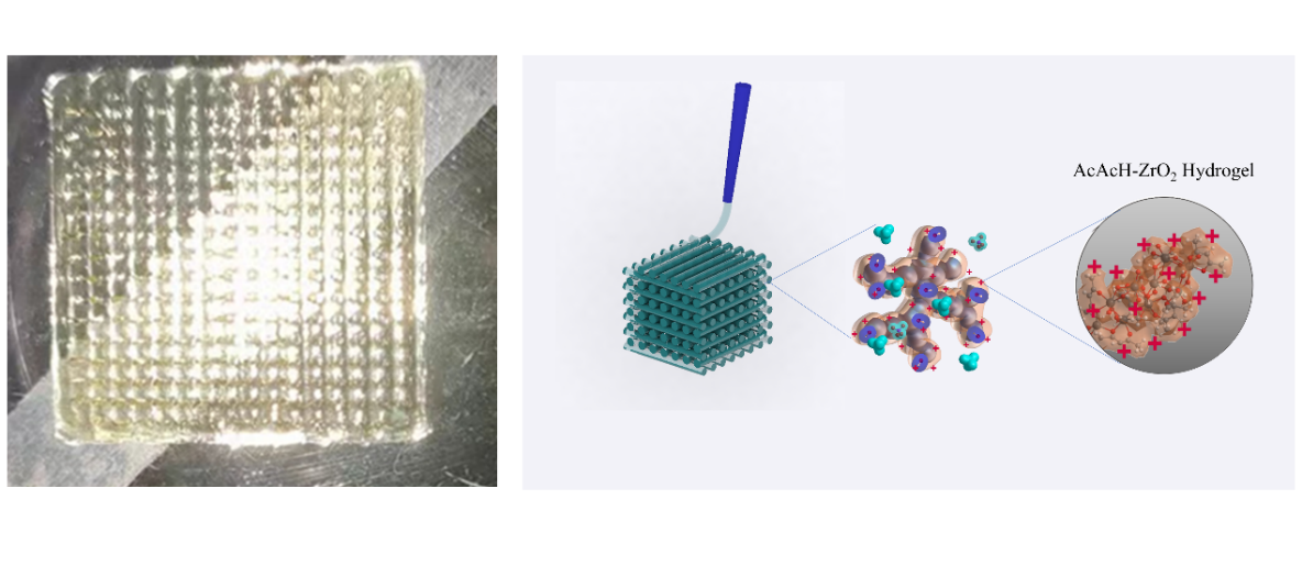 锆氧化物由于其高原子序数和较高的表面电位等特点在高能物理和环境保护等领域受到关注,但是高原子序数元素前驱体反应活性往往较高,如何在没有其它物质辅助的条件下实现高锆含量纳米多孔水凝胶的3D打印成为一个难题。