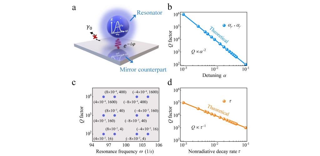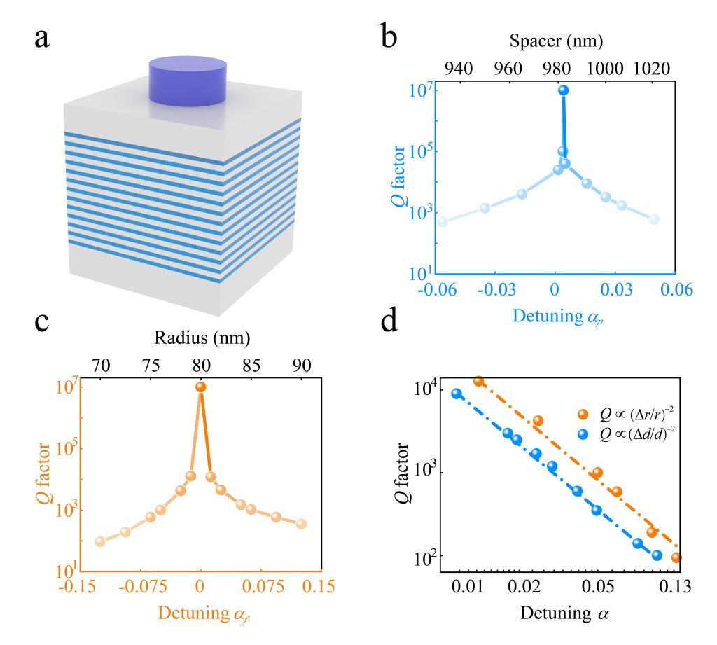 鉴于此,买球官方网站王占山和程鑫彬团队联合中国计量科学研究院屈继峰研究员,提出了一种层间耦合谐振子模型(图1a),从理论上严格推导了FP-BICs在微扰作用下的Q因子的演化规律,揭示了Q因子与相位失谐和频率失谐的平方成反比(图1b),同时又和非辐射衰减率成反比的理论规律(图1d),从而实现了FP-BICs谐振的定向工程(图1c)。进一步地,通过引入由超表面和多层膜组成的多层膜超表面,诱导产生了FP-BICs(图2a)并验证了理论的准确性。这种构型依赖于由超表面实现的光学谐振器与由多层膜实现的完美镜像对应物之间的耦合,通过改变间隔层模拟相位失谐(图2b),改变超表面单元半径模拟频率失谐(图2c),最终拟合结果表现出了与理论结果良好的一致性(图2d)。