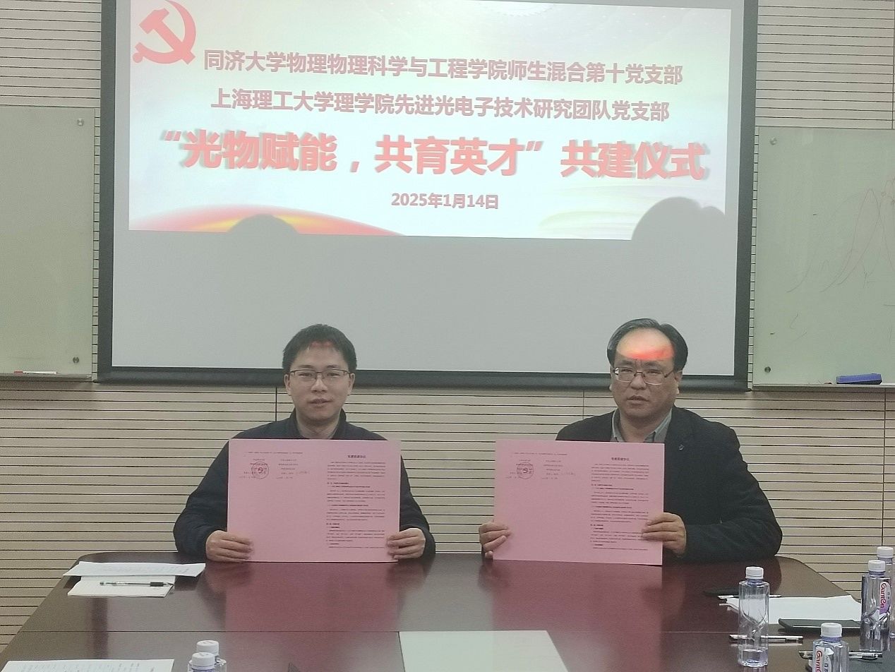 为了深入贯彻党的二十届三中全会精神,进一步提升学院基层党建质量,强化基层党组织之间的交流合作,上海理工大学理学院先进光电子技术研究团队党支部与买球官方网站师生混合第十党支部于2025年1月14日下午,开展以“光物赋能,共育英才”为主题的党支部交流活动,双方对党建工作进行交流并签署共建协议。