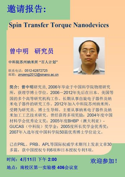 [4月11日]学术报告: Spin Transfer Torque Nanodevices